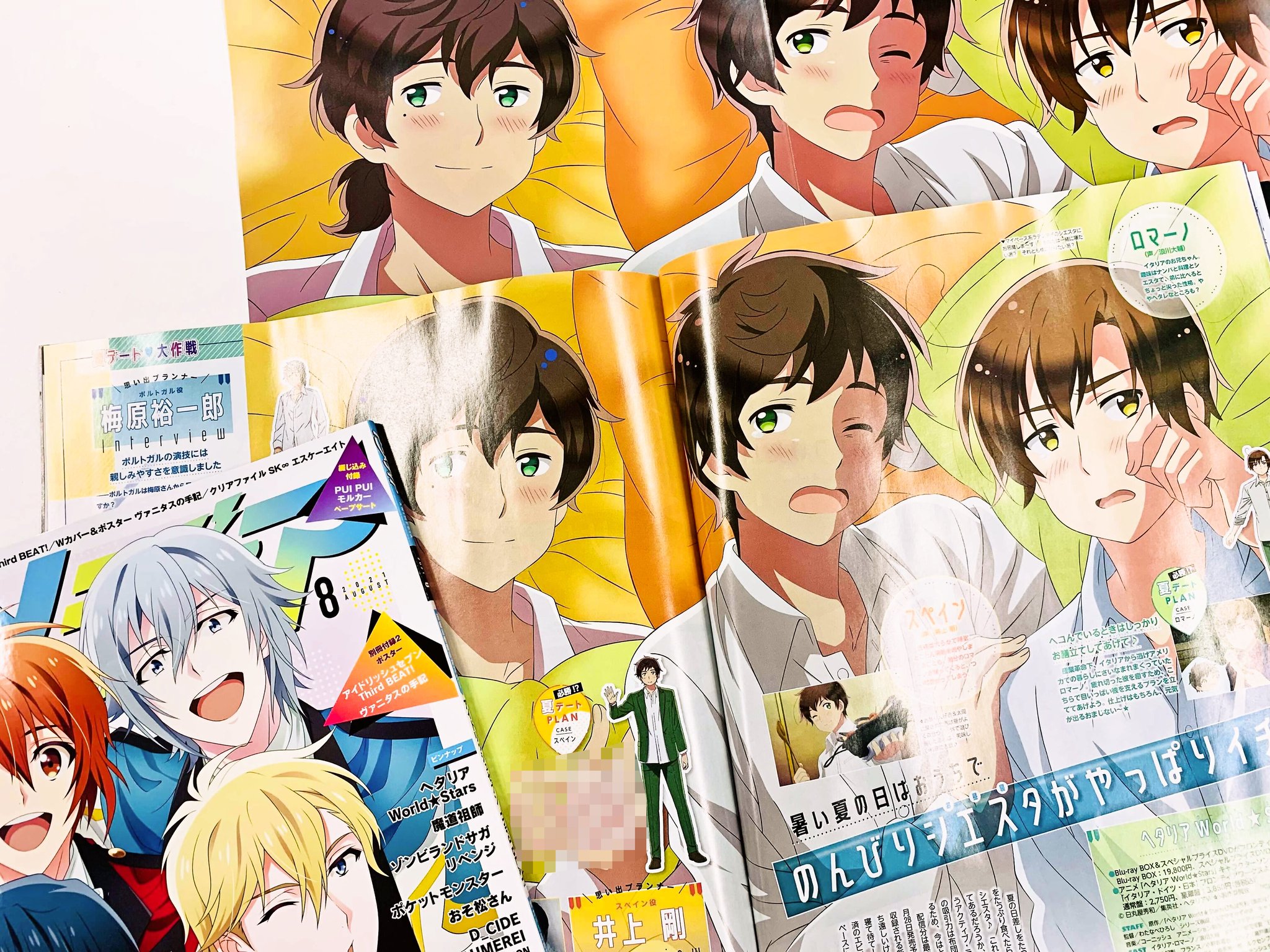 アニメディア編集部 9月号sk Fgow表紙 アニメディア8月号 ヘタリア World Stars 記事では ロマーノ ポルトガル スペインのシエスタ風イラストを掲載 さらにポルトガル役 梅原裕一郎 さん スペイン役 井上剛 さんにキャラの推しポイントなどを